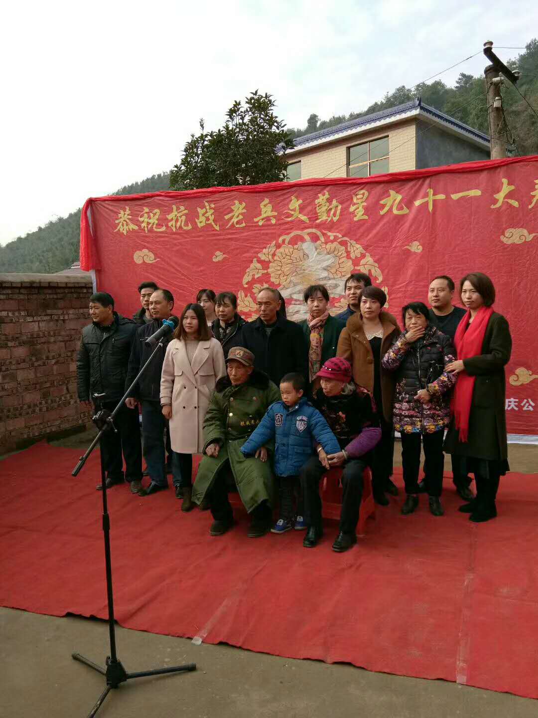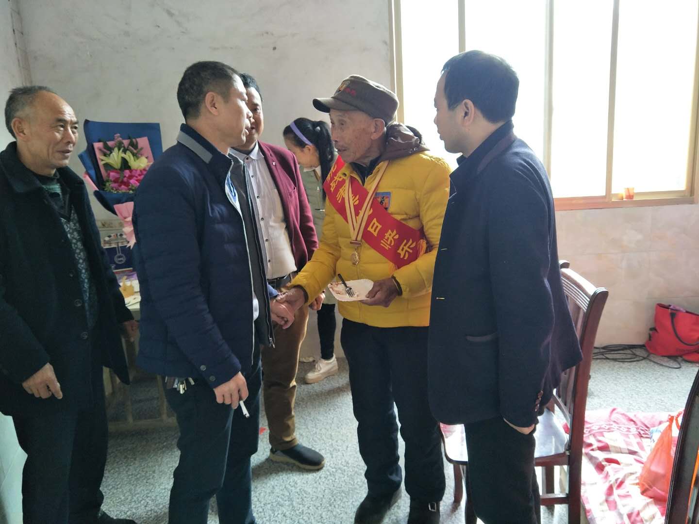 2017年11月23日省、市民革委员会、县民政局、吴集镇党委、政府前往吴集镇南山村祝贺抗战老兵文勤星91岁寿辰。