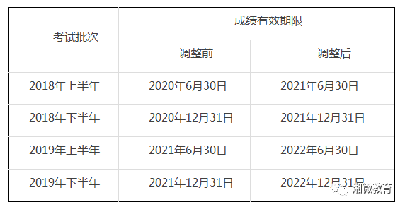 参加"2018年上半年至2019年下半年"各批次笔试,已通过的单科笔试科目成绩有效期延长1年,即成绩有效期由2年延长至3年,成绩查询网站页面会及时更新有效期限。参加"2017年下半年批次(含)之前"单科笔试科目成绩有效期已于2019年12月31日前终止,因此不再延长。(延长批次详见下表)