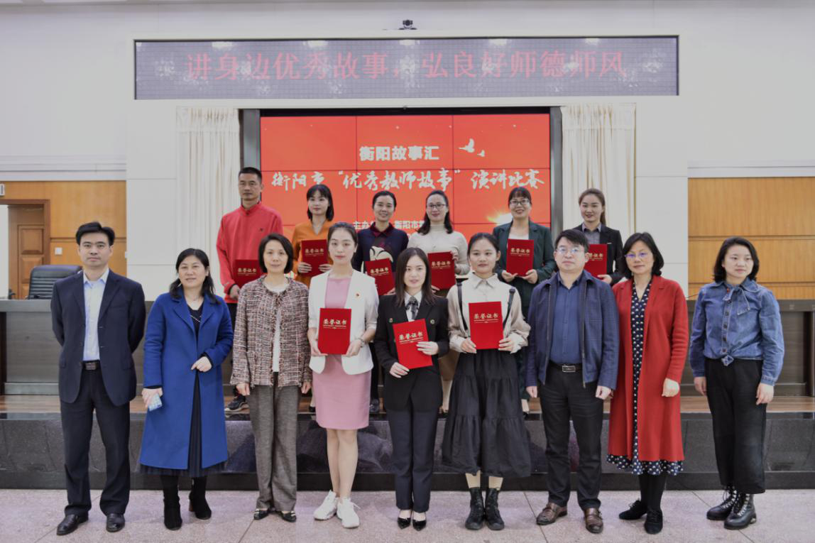 ▲衡阳市"优秀教师故事"演讲获奖选手与评委合影
