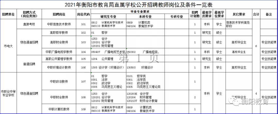 附件:1.《2021年衡阳市教育局直属学校公开招聘教师岗位及条件一览表》