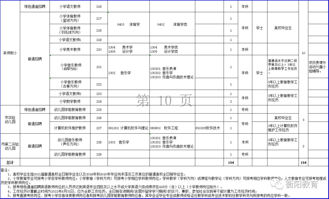 二、招聘单位、岗位及计划数公开招聘教师154名。具体招聘单位、招聘岗位及计划数见《2021年衡阳市教育局直属学校公开招聘教师岗位及条件一览表》(见附件1)。点击查看大图
