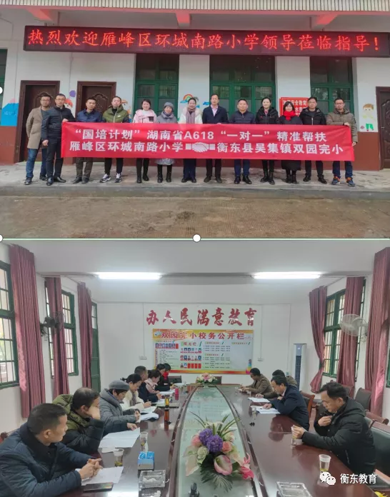 1月16日,环城南路小学全体行政、教师代表与雁峰区教育局基教股、办公室负责人来到双园完小,开展湖南省国培计划"一对一"精准帮扶现场调研工作。