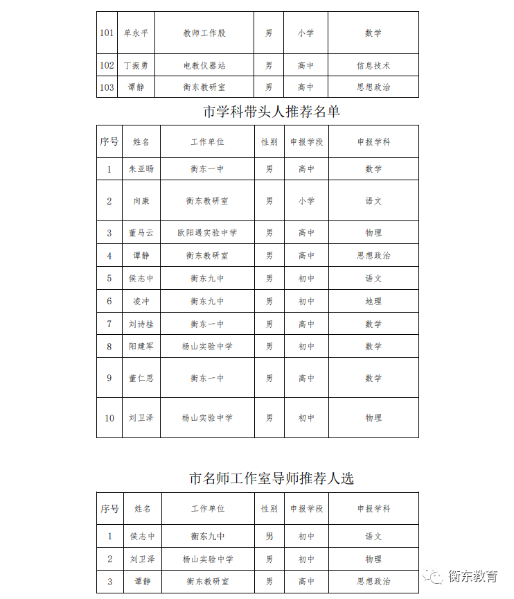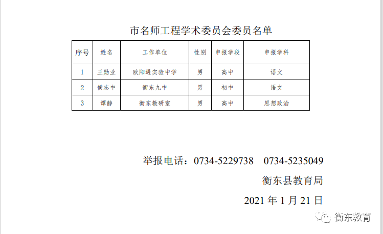 经教师个人申请,学校推荐,专家评审,县教育局初选,同意推荐颜亚华等103名同志参评市骨干教师,朱亚旸等10名同志参评市学科带头人,侯志中等3名同志参评市名师工作室导师,王勋业等3名同志参评市名师工程学术委员会委员,现予以公示。公示期限:2021年1月21日至1月23日。欢迎广大教职员工以信函、电话、当面反映等形式对推荐人选存在的问题予以反映。反映问题,必须真实、准确,严禁借机造谣中伤、串联诬告。反映问题者将受到保护。