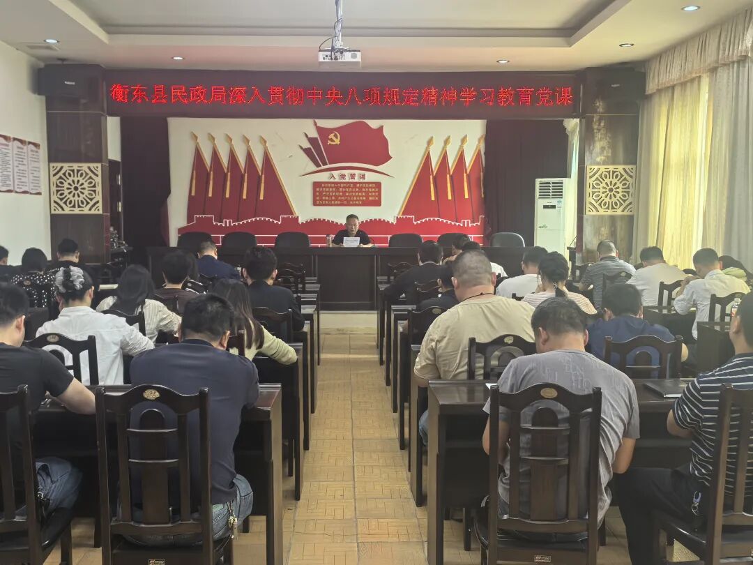 4月18日,衡东县民政局2025年民政大学堂第一期在民政局五楼会议室正式开讲。民政局党组书记、局长刘春元同志以《坚守中央八项规定精神,筑牢民政廉洁自律防线》为题,为全局90余名干部职工讲授了一堂思想深刻、内容充实的廉政党课。