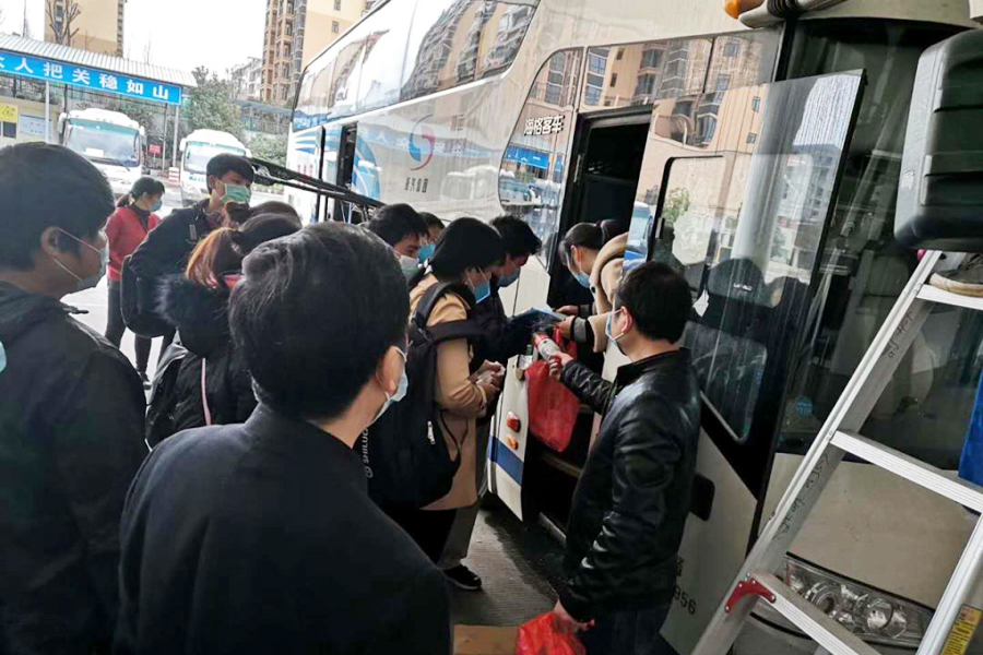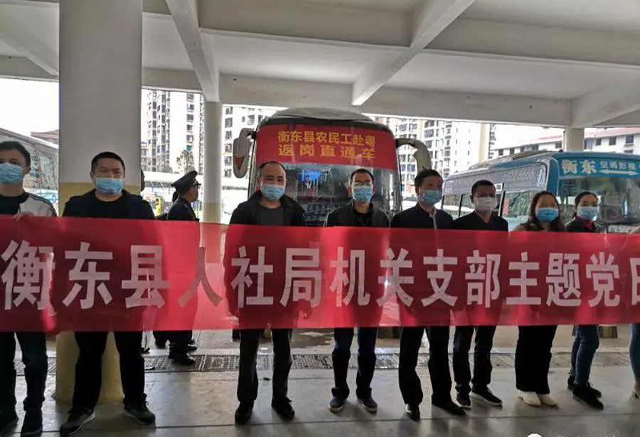 2月底,一辆辆大巴车从衡东县汽车站出发,载着外出务工人员出发前往深圳、广州等地。这是县人社局为响应全国复工复产号召,"包车"免费为返岗务工人员集中出行提供返岗包车服务。乘客分散就坐,每辆车客座率均控制在50%以内,并进行了严格的消毒、通风,约1000余劳动者得以安全返岗。