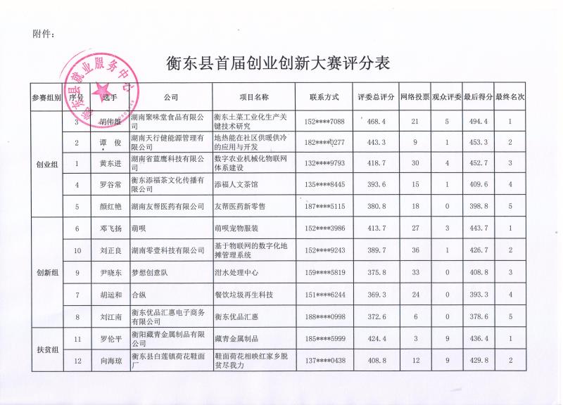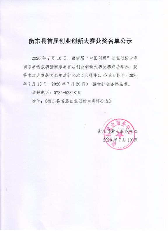 衡东县首届创业创新大赛获奖名单公示