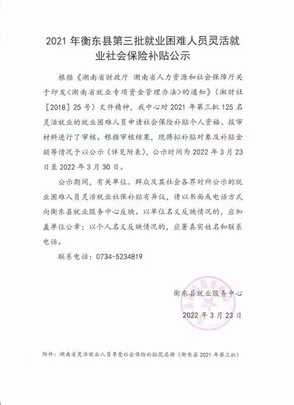 湖南省灵活就业人员享受社会保险补贴花名册(衡东县2021年第三批)