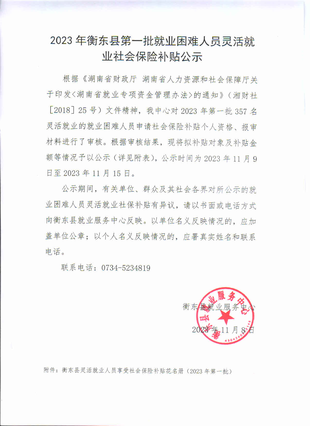 附件:衡东县灵活就业人员享受社会保险补贴花名册(2023年第一批)