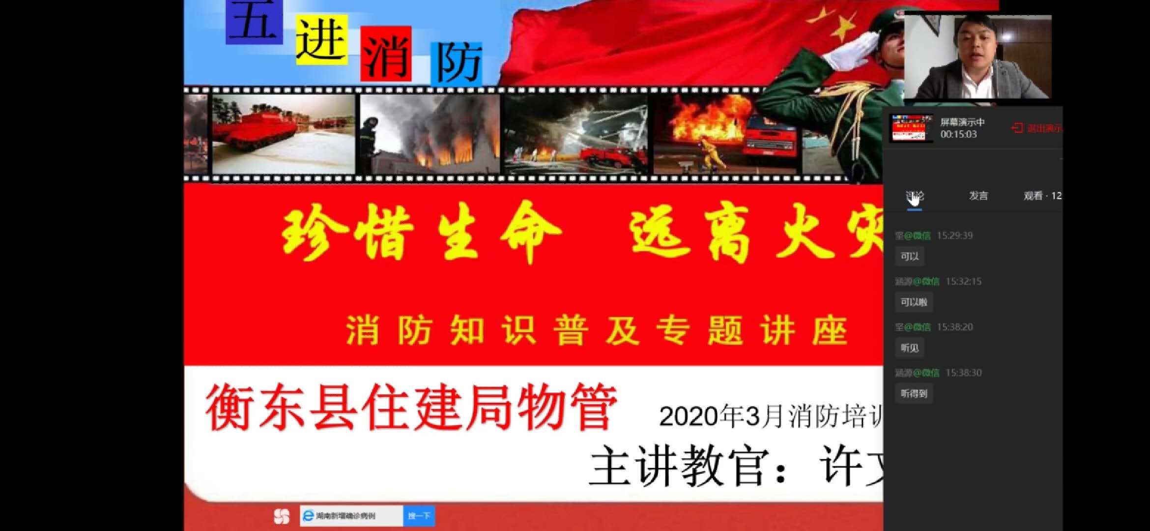 为切实加强我县物业小区消防安全管理,普及消防安全知识,进一步提升物业行业从业人员的消防安全意识。2020年3月2日下午,县住建局特邀请衡东县消防救援大队许文建教官为我县物业公司员工进行了一场消防安全知识网上视频培训。