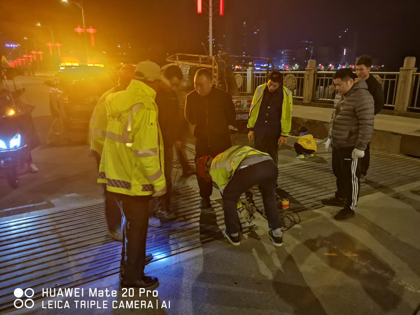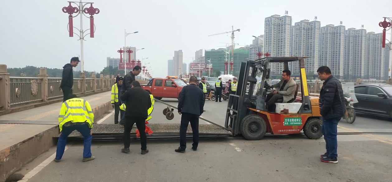 2020年10月20日,衡东县住建局在对兴衡大桥日常巡查时,发现桥梁正中间的伸缩缝防护钢板破损,存在安全隐患。兴衡大桥过往车流量大,在保障道路安全、畅通的前提下,制定了抢修方案和安全保畅措施,主动协调交警部门实行交通管制措施,采用半幅封闭施工,引导车辆并道行驶,对损坏的桥梁伸缩缝处覆盖上钢板,临时恢复此路段的交通通行。在防护钢板安放完毕后,夜间再调整、加固等,至晚上11点顺利完成,消除了安全隐患。(衡东县住建局宋竺珊綦亮)