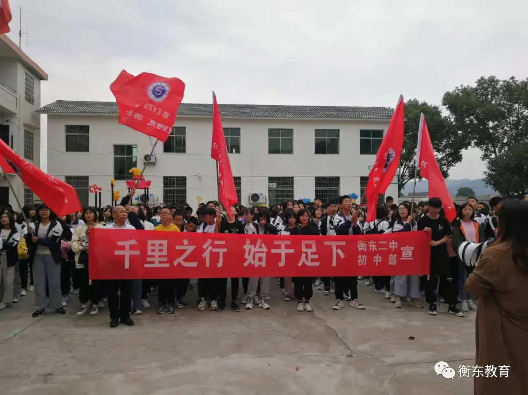 冬日暖阳下,一群身着校服的学生们挥舞着旗帜行走在乡间小路上,兴致勃勃,神采飞扬。这是衡东二中初三年级的同学们正在进行十公里远足活动。 据悉,衡东二中一直坚持"五育并举"的办学理念,重视中学生身心的全面发展,激发学生们健康成长的内心动力,旨在通过十公里的远足锻炼身体的同时锤炼同学们脚踏实地,坚持不懈,永不言弃的意志和品质,为学习"减负",为心灵"释压",为生活"增彩"。
