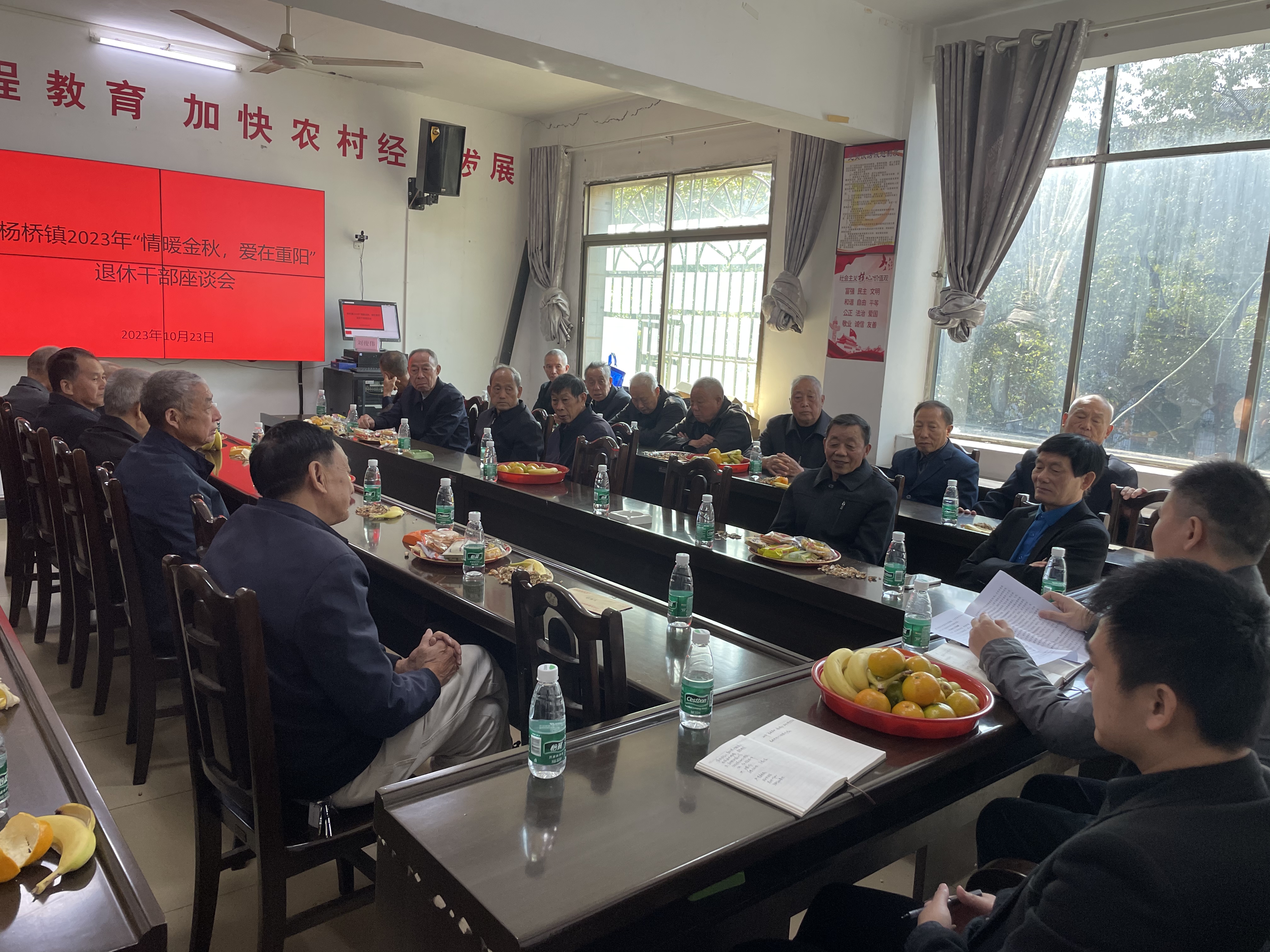 金秋十月,丹桂飘香,10月23日上午,杨桥镇召开2023年"情暖中秋,爱在重阳"退休干部座谈会,镇党委书记彭贵禄,镇党委副书记刘俊伟、等领导与退休老同志们齐聚一堂,同庆佳节,共谋发展。镇党委书记彭贵禄代表杨桥镇党委、政府向全镇退休老前辈、老同志们致以节日的问候和美好的祝愿!他表示,本次座谈会既是向各位老前辈、老同志们为杨桥做出的突出贡献表示衷心的感谢,同时也为了听取大家对我镇新时期发展的意见和建议。