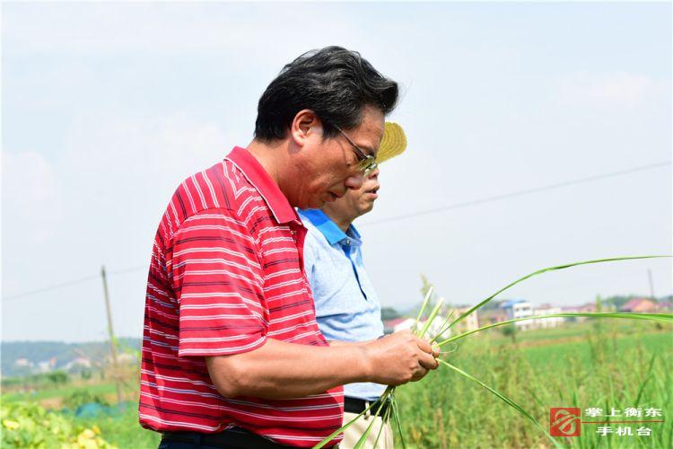 图:吴伟生在新塘镇龙头村察看巨型稻