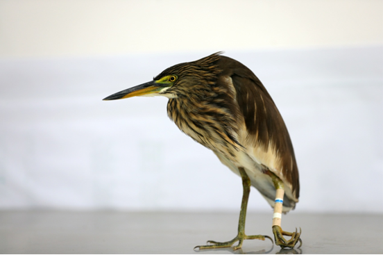 池鹭通常栖息于稻田、池塘、湖泊、水库和沼泽湿地等水域,有时也见于水域附近的竹林和树上,属于夏候鸟。管理站的工作人员向立律在洣水边巡护时,看到岸边躺着一只池鹭,奄奄一息的样子。仔细检查后,发现其左腿受伤骨折,无法飞行,连站立都很难。随即将鸟儿带回管理处,与资源保护股的工作人员进行会诊,并实施救助治疗,清洗伤口,用胶布进行包扎,给它喂食,悉心的照顾着。经过救助,目前池鹭精神状态良好。