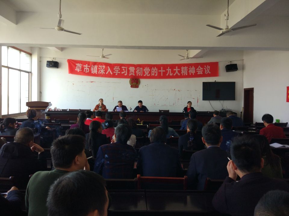 2017年10月30日草市镇召开全体干部职工会议,深入学习党的十九大会议精神。会上指出要把认真学习、宣传、贯彻好十九大精神,作为当前和今后一个时期的头等大事来抓,全力推动十九大精神在草市镇落地生根。