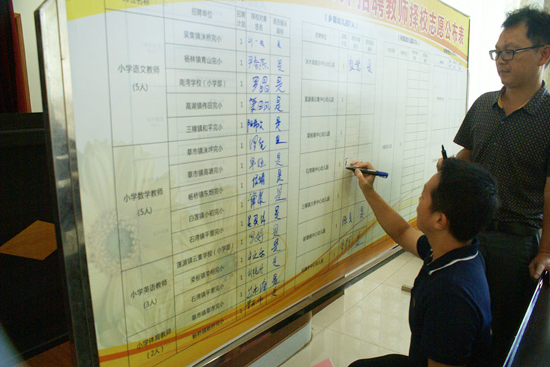 此次我县教师招聘考试共751人参加笔试,笔试科目包含小学、初中、高中语文、数学、英语等14个科目,计划招收110名教师,经过笔试、面试、体检和考核后拟录用99名,其中4名硕士研究生。本次公开择校分类别、分科目按照综合成绩从高到低选择学校,如综合成绩相同的,笔试成绩高者优先。考生现场在择校志愿公布表上选择学校并签名确认,现场所有考生都是“监督员”,整个过程公开透明,组织有序。