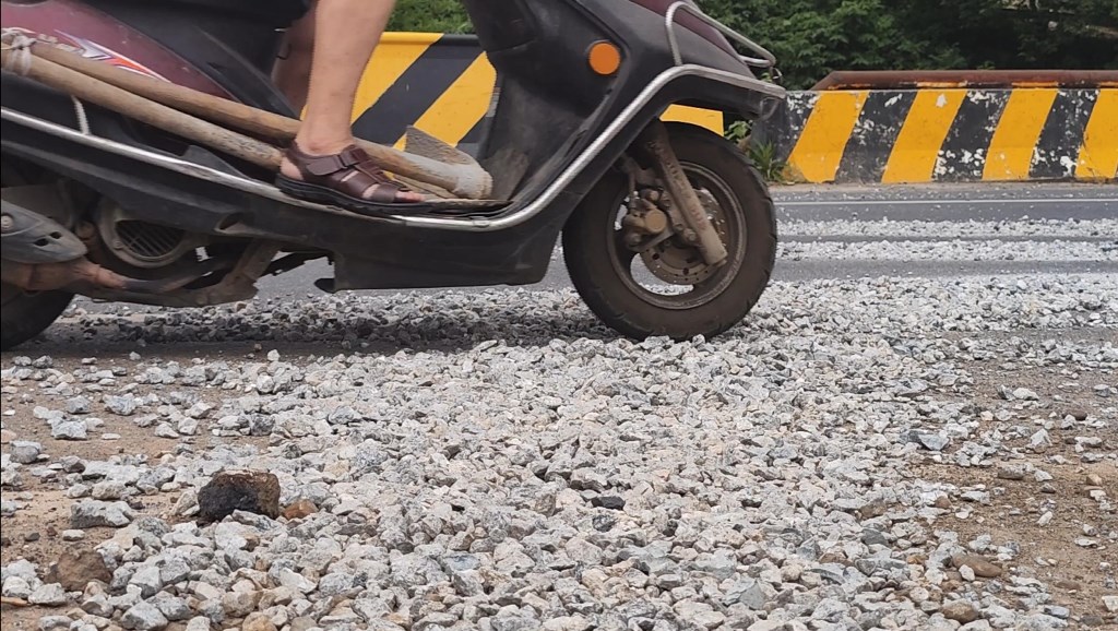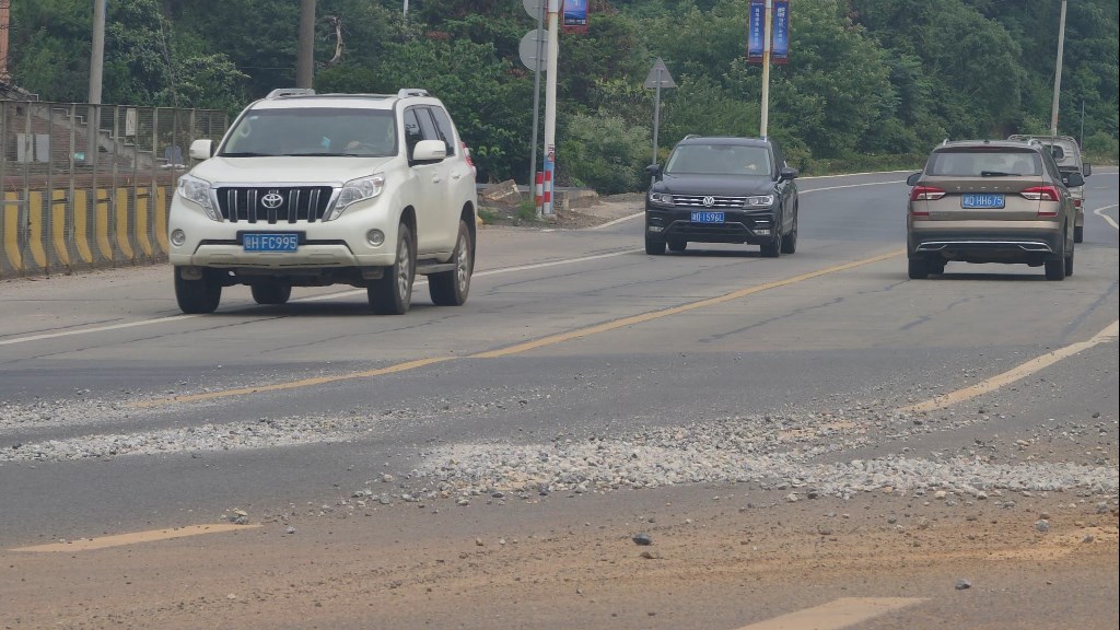记者在此提醒,希望有关部门能够及时清理路面,不然碎石飞溅将对过往车辆和人员造成安全隐患,同时容易引发车轮滑移,产生交通事故。