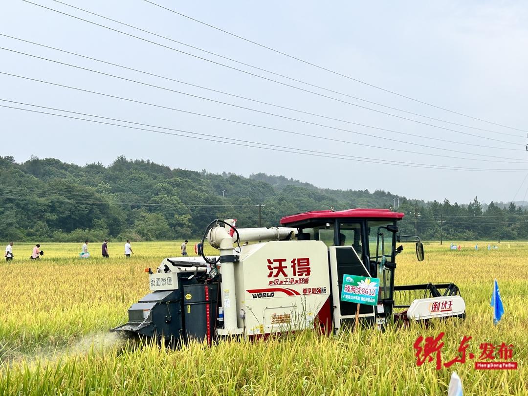 在低镉品种“臻两优8612”示范基地,大家认真观摩基地水稻品种长势情况,听取相关负责人对该品种特性介绍。随着省农科院专家的一声令下,收割机开始进行收割测产。