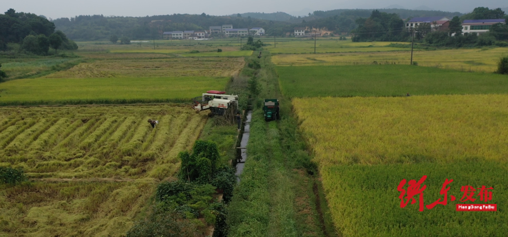 荣桓镇长岭社区,这里的中稻已经成熟,一簇簇沉甸甸、金灿灿的稻穗铺满了稻田,在微风轻抚下,掀起层层稻浪。轰鸣的收割机、运粮车来回穿梭,现场呈现出一派忙碌的丰收景象。