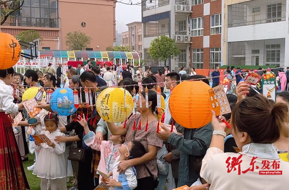 活动现场亮点纷呈,月宫背景墙前,幼儿围在“月宫仙子”身旁,认真思考、对答灯谜;山河社稷图旁,稚嫩的童声此起彼伏,孩子们齐声吟诵《静夜思》,尽显童真与文化韵味;蹴鞠、投壶等传统游戏区更是热闹非凡,欢笑声不断,亲子协作完成游戏,其乐融融。
