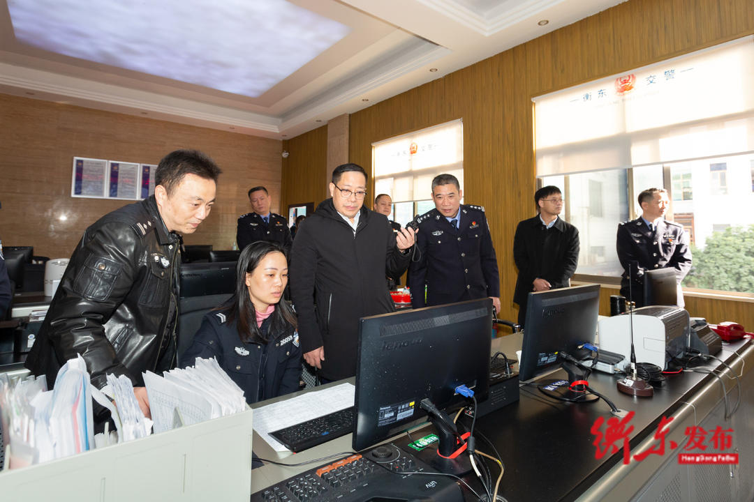 图:蒋崇华在衡东交警大队指挥中心查看实时路况、执勤点值守等情况
