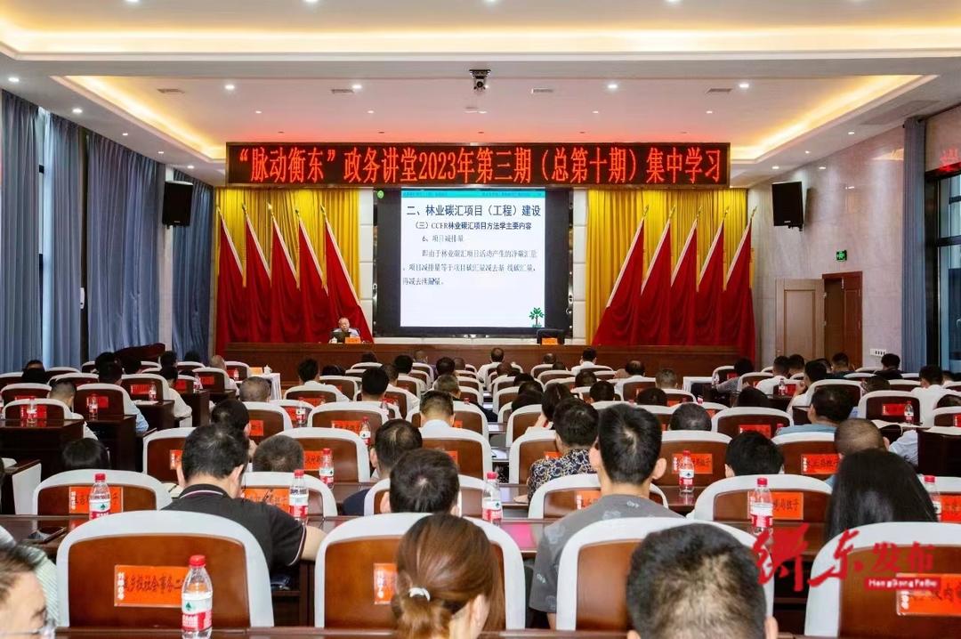 本期政务讲堂邀请到的授课人是湖南省农林工业勘察设计研究总院副总工程师、 省碳达峰碳中和专家咨询委员会专家杨海军,⻓沙银行衡东支行党支部书记 、行⻓杨苾。杨海军以林业碳汇项目(工程)建设为题,从基层概念、林业碳汇项目建设等方面进行了条理清晰、详略得当的讲解,为我县林业碳汇项目建设提出建设性工作意见建议,具有很强的针对性和指导意义。杨苾以“政银联动促高质量发展”为题,讲述在新发展阶段,长沙银行将持续加强政银联动,从全力支持重点项目建设和产业发展、全力服务乡村振兴、与科局合作共赢、向社会展示衡东等四个方面精准发力,共同推动衡东经济高质量发展。