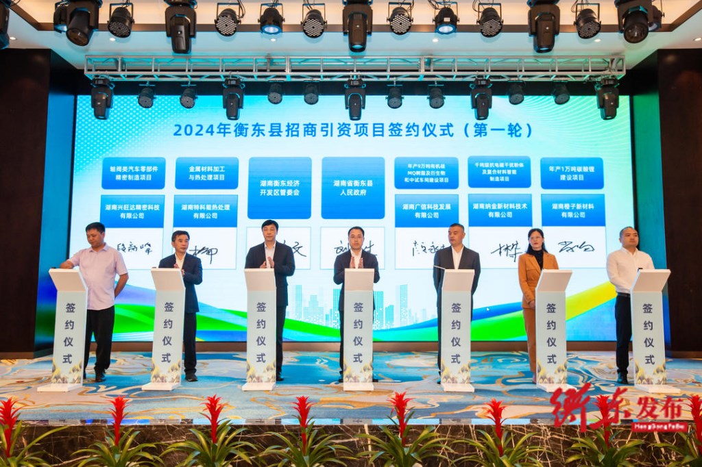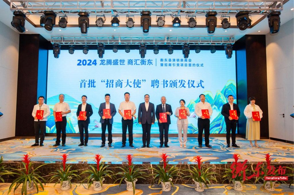活动首先播放了衡东宣传片《逐梦·征程》,宣传片对 2023年度招商引资、项目落地、项目推进等工作进行了回顾和总结,对2024年招商引资工作进行了展望。活动中,县委常委、常务副县长刘知生代表县委县政府作重点项目推介;县委副书记、县长蒋崇华为首批“招商大使”颁发聘书;县委常委、副县长、经开区党工委书记周叶华宣读全员招商《倡议书》;县人民政府和县经开区分别与10个招商项目进行现场签约。