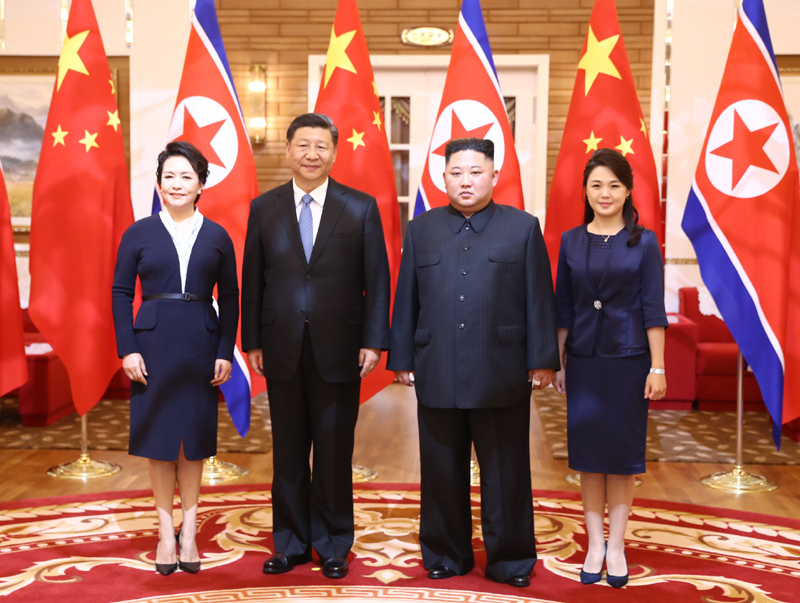 6月20日,中共中央总书记、国家主席习近平在平壤锦绣山迎宾馆同朝鲜劳动党委员长、国务委员会委员长金正恩会谈。这是会谈前,习近平和夫人彭丽媛同金正恩和夫人李雪主合影。新华社记者 鞠鹏 摄